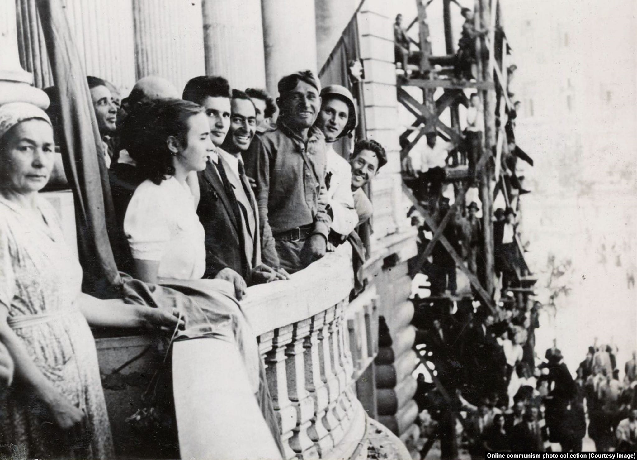 Nicolae (in black jacket) and Elena Ceausescu (with white blouse) on a balcony overlooking Bucharest’s University Square. The pair were welcoming the arrival of Soviet troops to Romania after a coup overthrew the country’s pro-Nazi ruler in August 1944.