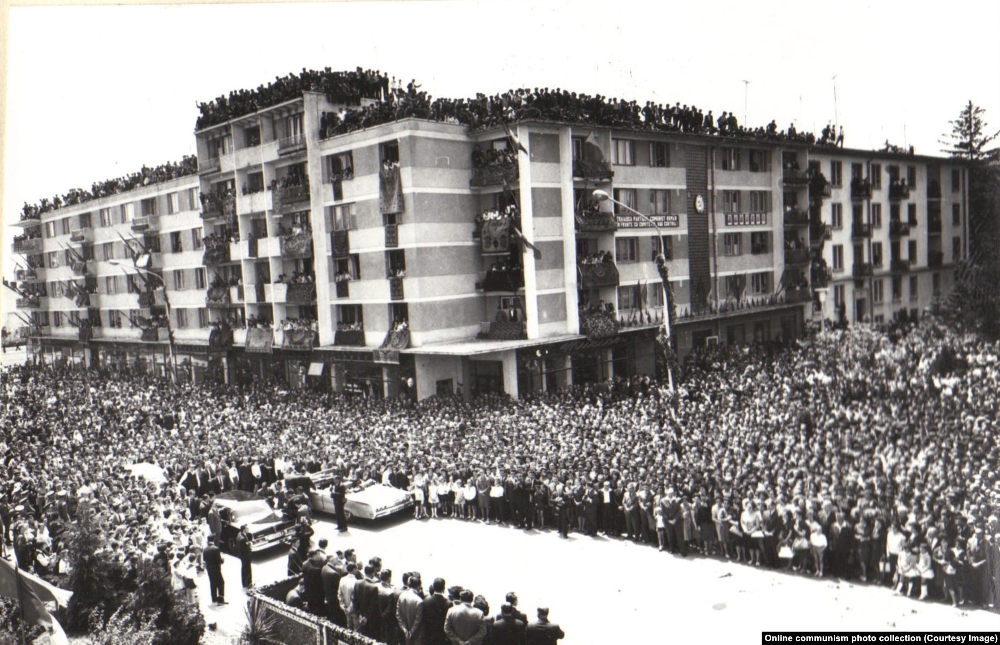 Crowds gather upon Nicolae Ceausescu's arrival in Pitesti, near Bucharest, in 1966. The photo was taken a year after the former shoemaking apprentice rose to power in Romania.