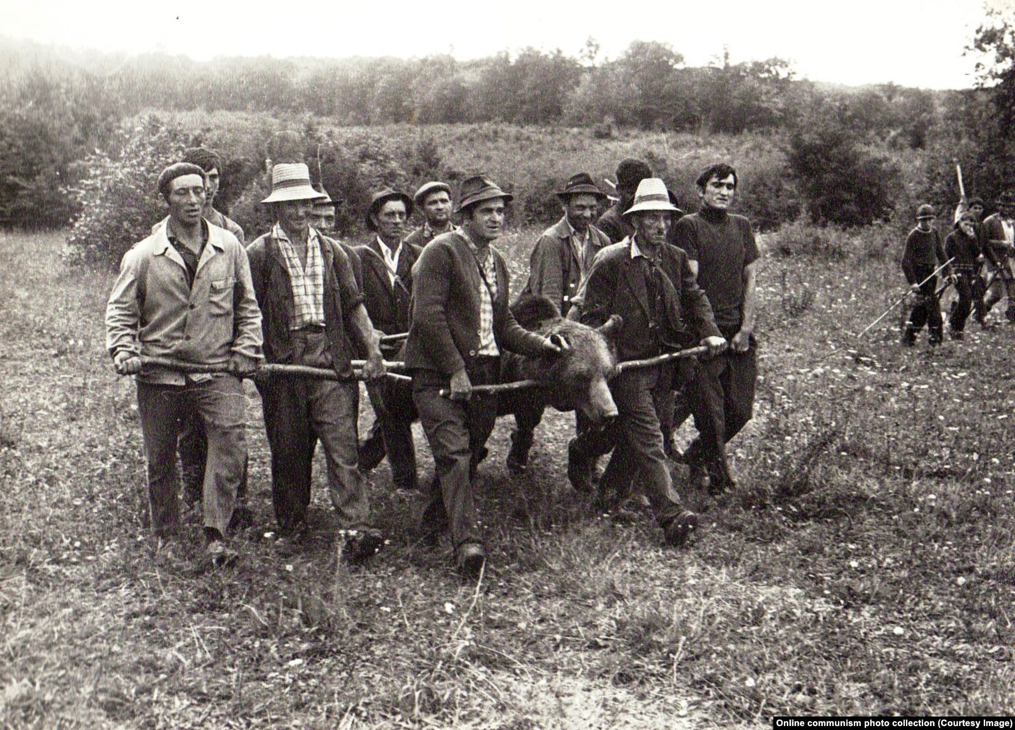 Men carry a bear carcass in from the forest for Ceausescu’s inspection during a hunting trip in 1972.