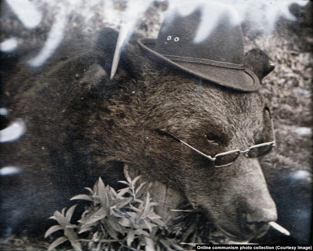 A bear after being killed during one of Ceausescu’s hunting trips with a cigarette in his nostril, glasses, and a hat.