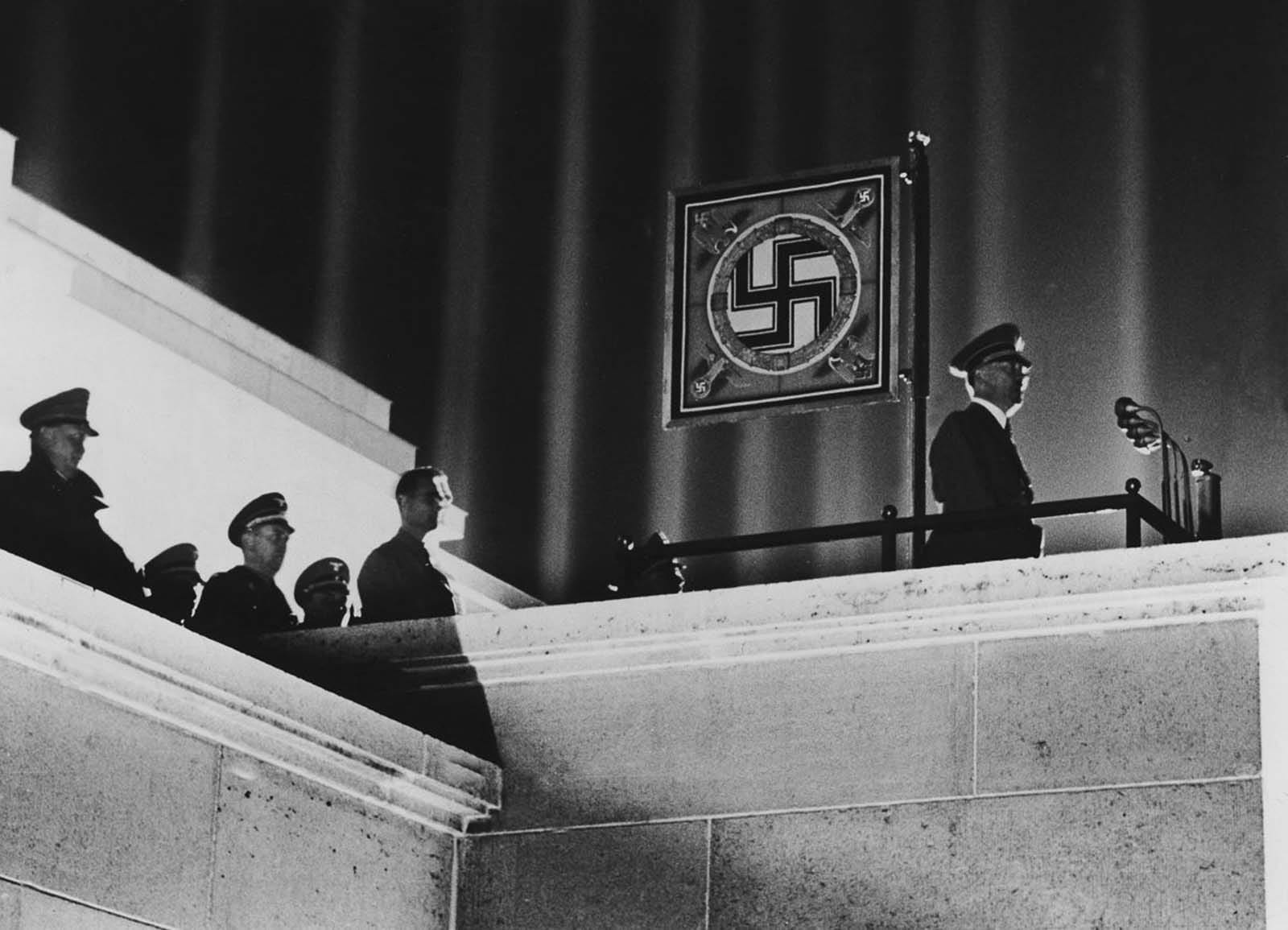 Hitler delivering an impassioned speech at the Nuremberg rallies, illuminated by the Cathedral of Light, 1937.
